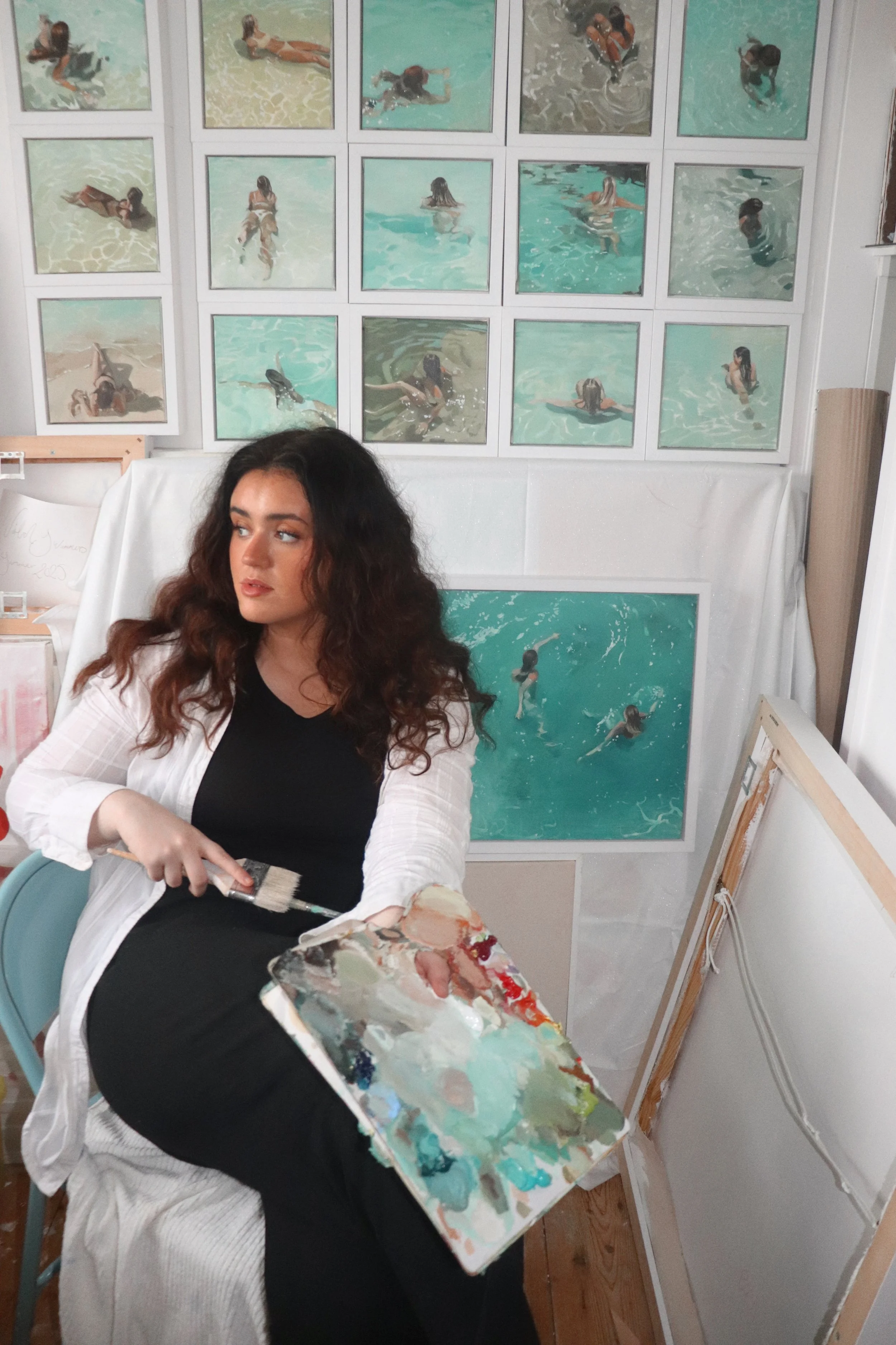 In my Wild Swimmers series, figures are often turned away, partially obscured, or absorbed into light and water. This lack of specificity is intentional. By withholding identifiable facial features, the figures remain open, allowing the viewer to step into the scene. These paintings are not portraits of particular individuals; they are invitations to shared experience and emotional recognition. Water becomes both physical and psychological space: a site of immersion, recalibration, and gentle vulnerability. I am drawn to the tension between public environments, beaches, lagoons, open landscapes, and deeply private states of being. A swimmer may be surrounded by others, yet entirely inward. In these suspended moments, calm holds vulnerability, recovery, and presence at once. These paintings are not about escape as avoidance, but about permission to rest and recover from the constant stimulation of daily life.