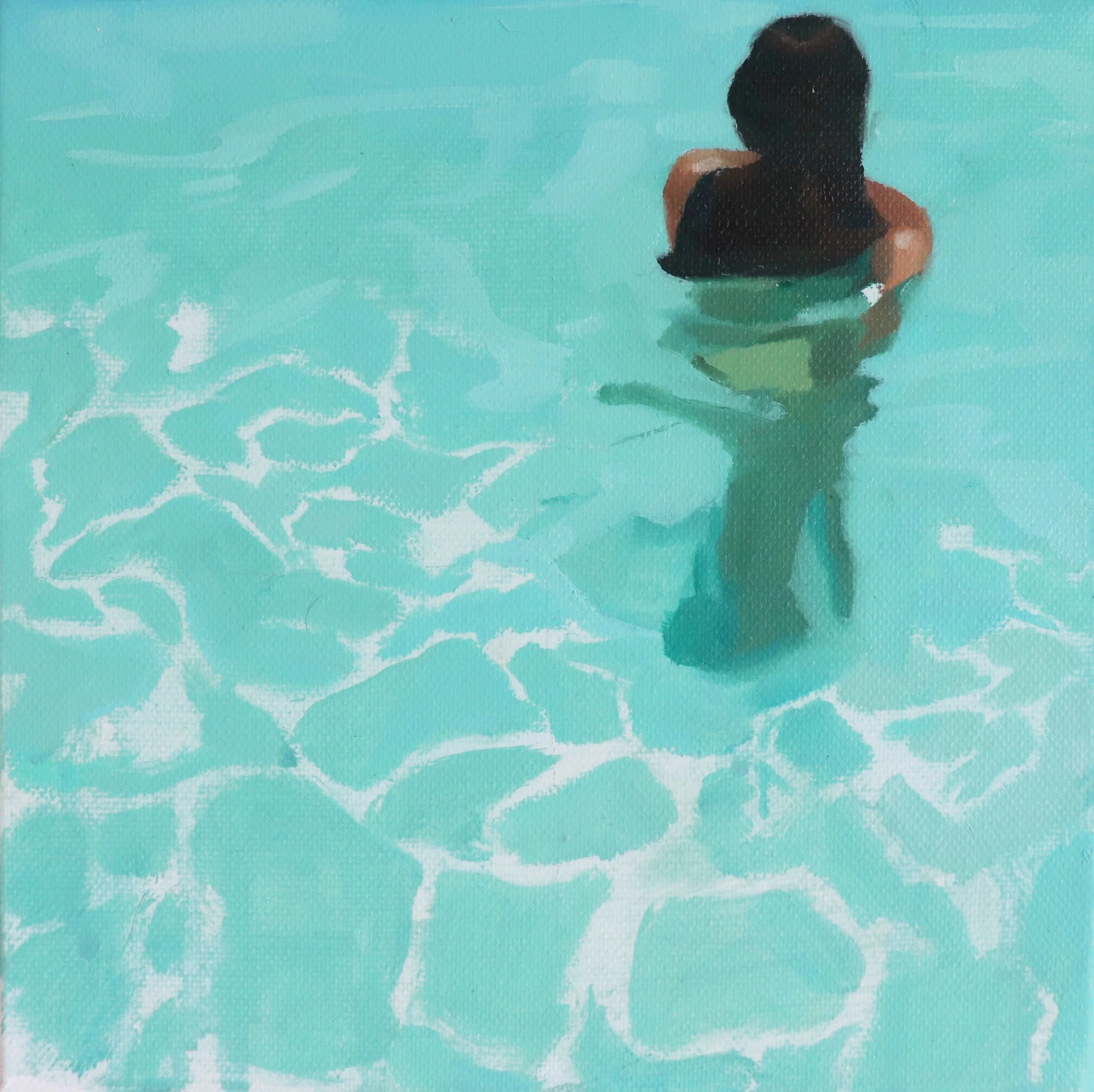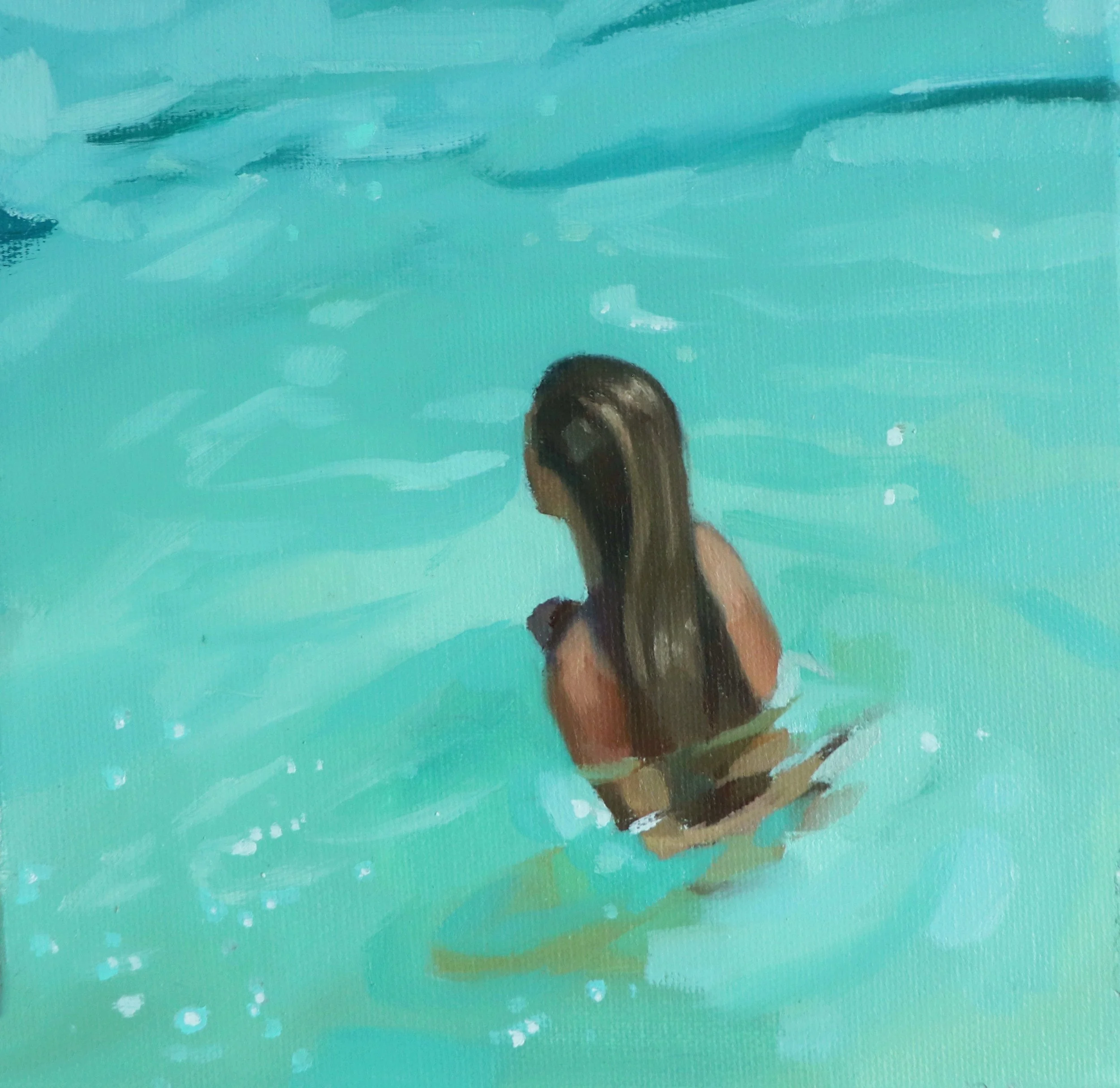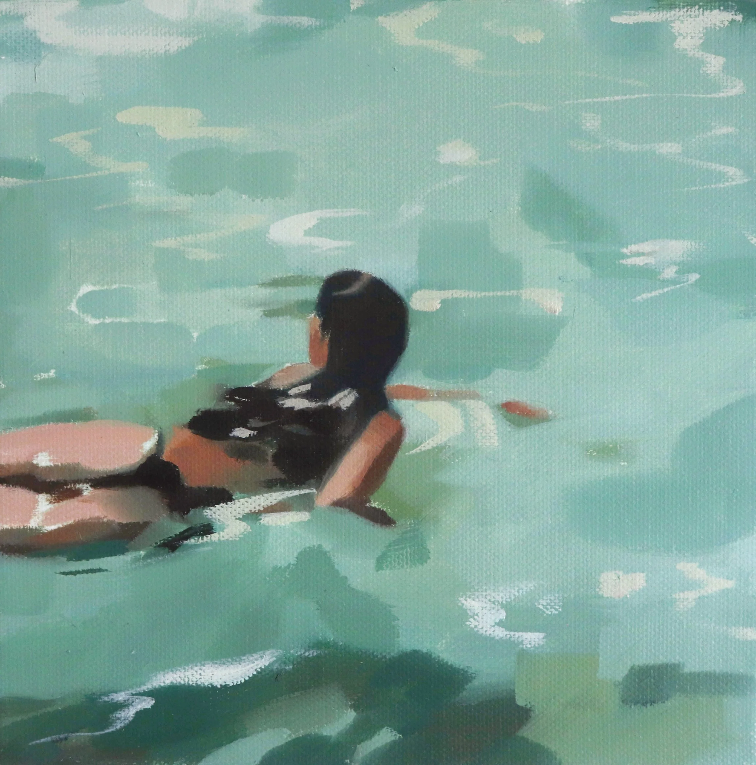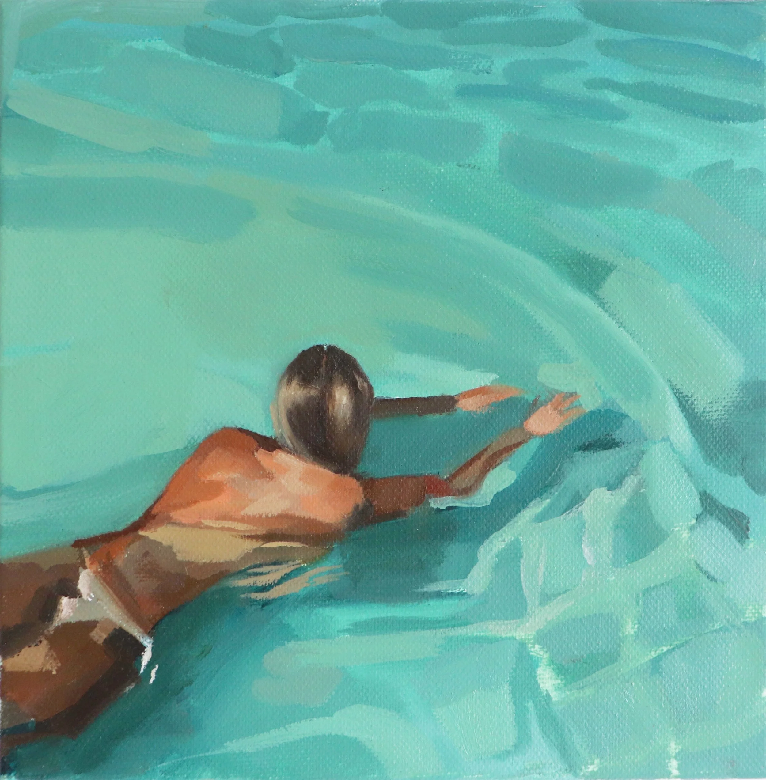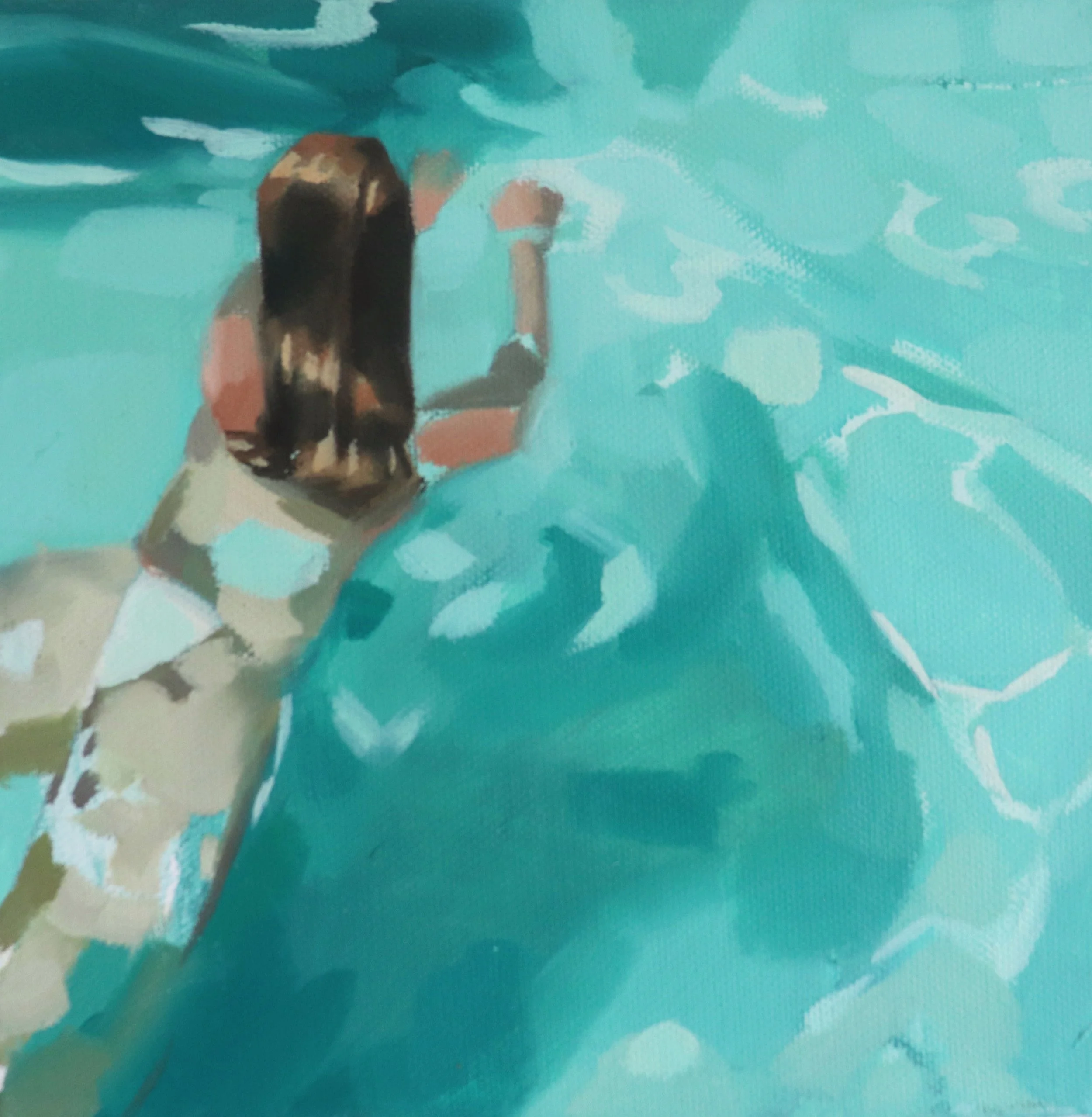 Inspired by the brave wild swimmers of west coasts and the pleasure of leisure This mini series celebrates our relationship with the ocean. Inspired by escapism, I wanted to explore the jewelled greens and blues of the Atlantic which has been a back drop to my life growing up in Cornwall. The series showcases swimmers playfully wading in dreamy waters on balmy days with a simple mission to allow you to envisage your self doing the same.