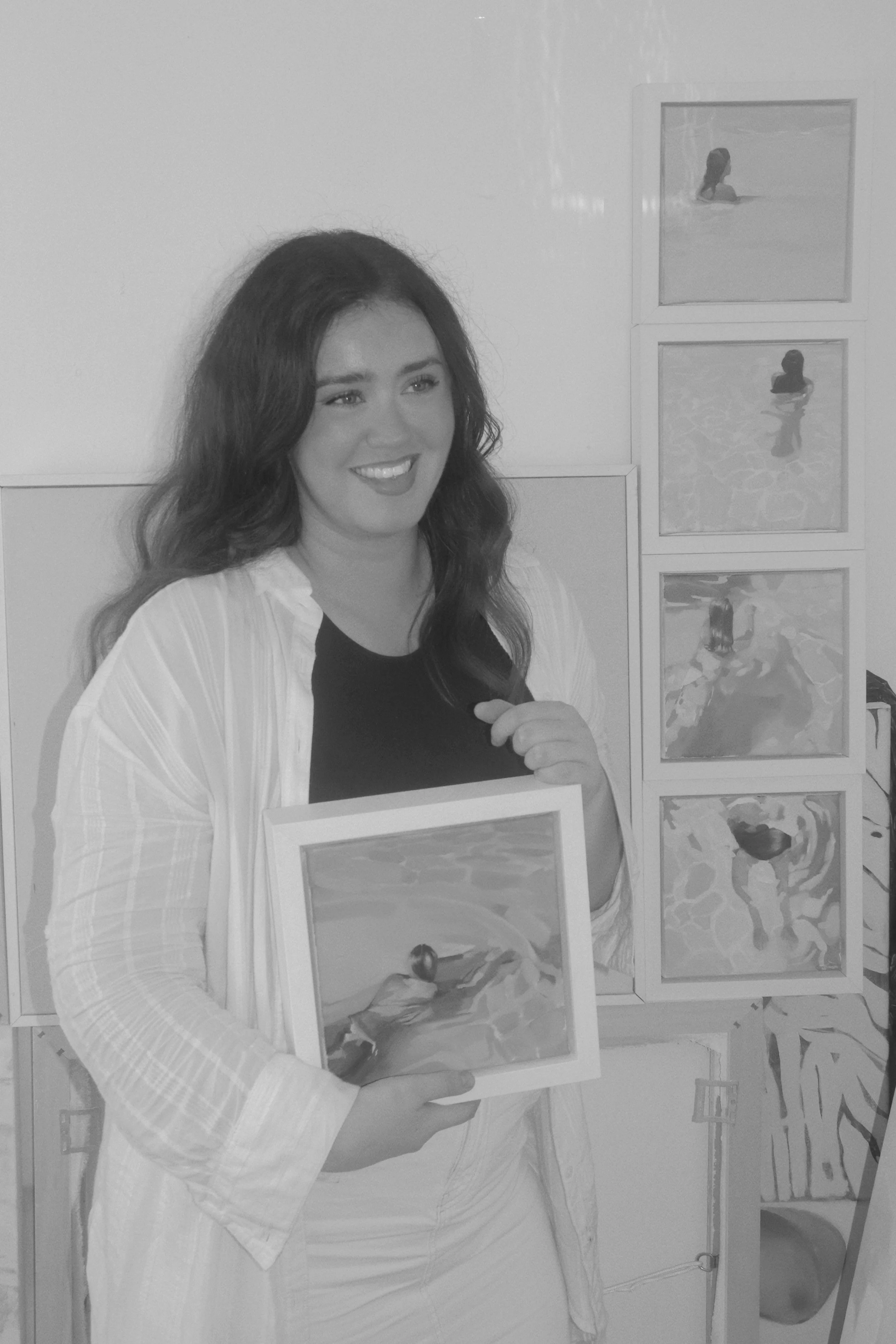 The Atlantic has been a back drop to Shaunna’s life growing up in Cornwall, which has informed her ongoing Wild swimmer collection. The works are inspired by our healing relationship with the ocean. How we submerge in to the jewelled greens and blues of the Atlantic can make our troubles seam so much smaller, The Swimmers are often solitary, to highlight the importance of how spending time alone in nature, has a positive effect on mental wellbeing, offering space for clarity, reflection and emotional rejuvenation. The swimmers are always looking away from the viewer, making them only identifiable from their hair colour and skin; this allows the identity of the swimmers to become subjective to whoever is observing. Shaunna feels this allows her audience to opportunity to envisage themselves, playfully wading in the dreamy coastal waters on balmy days, offering a much needed therapeutic outlet to the noise of the world.
